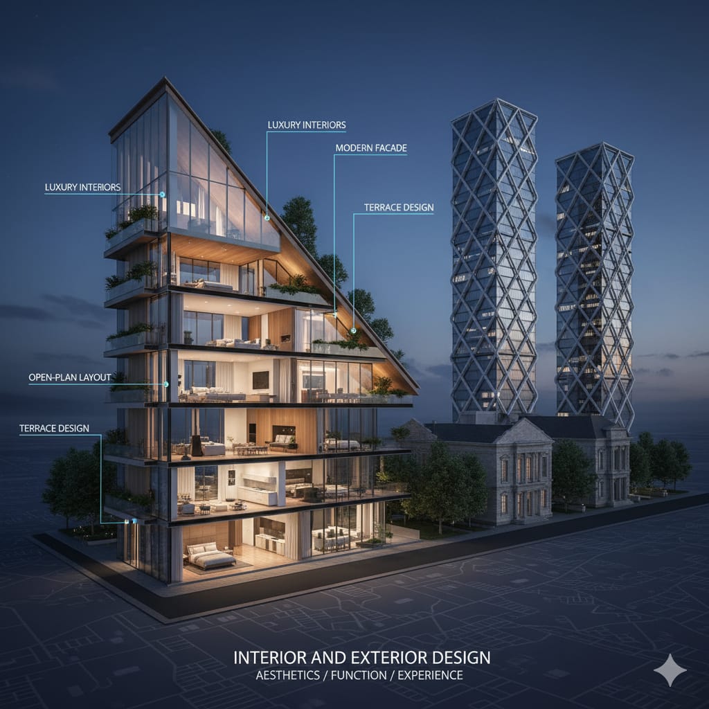 Our interior and exterior design services celebrate detail, texture, and proportion. We craft interiors that blend comfort with character through thoughtful materials, lighting, and spatial harmony.
